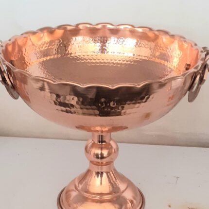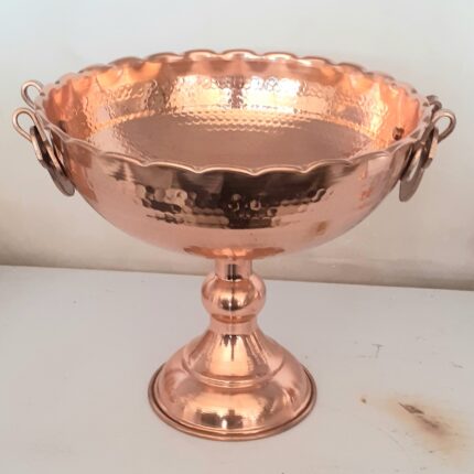 جام میوه خوری مسی زنجان ، ارتفاع ۲۳ قطر ۲۴ ، پایه و دسته دار ، چکشی ، جنس مس