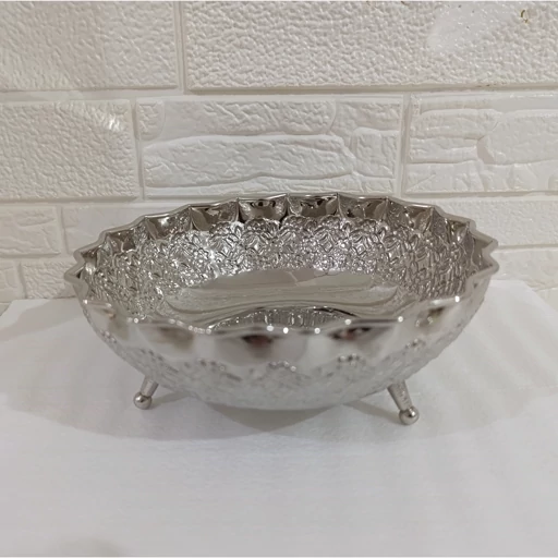 کاسه سه پایه آجیل خوری یا شکلات خوری مسی دور کار طرح ریزگل برجسته روکش کروم پایه ها به بدنه جوش خورده محصول رنگ ثابت در عکس شفافیت محصول رو مشاهده میکنید قطر دهانه 20 سانتیمتر  سایز بزرگتر برای میوه این کار موجود