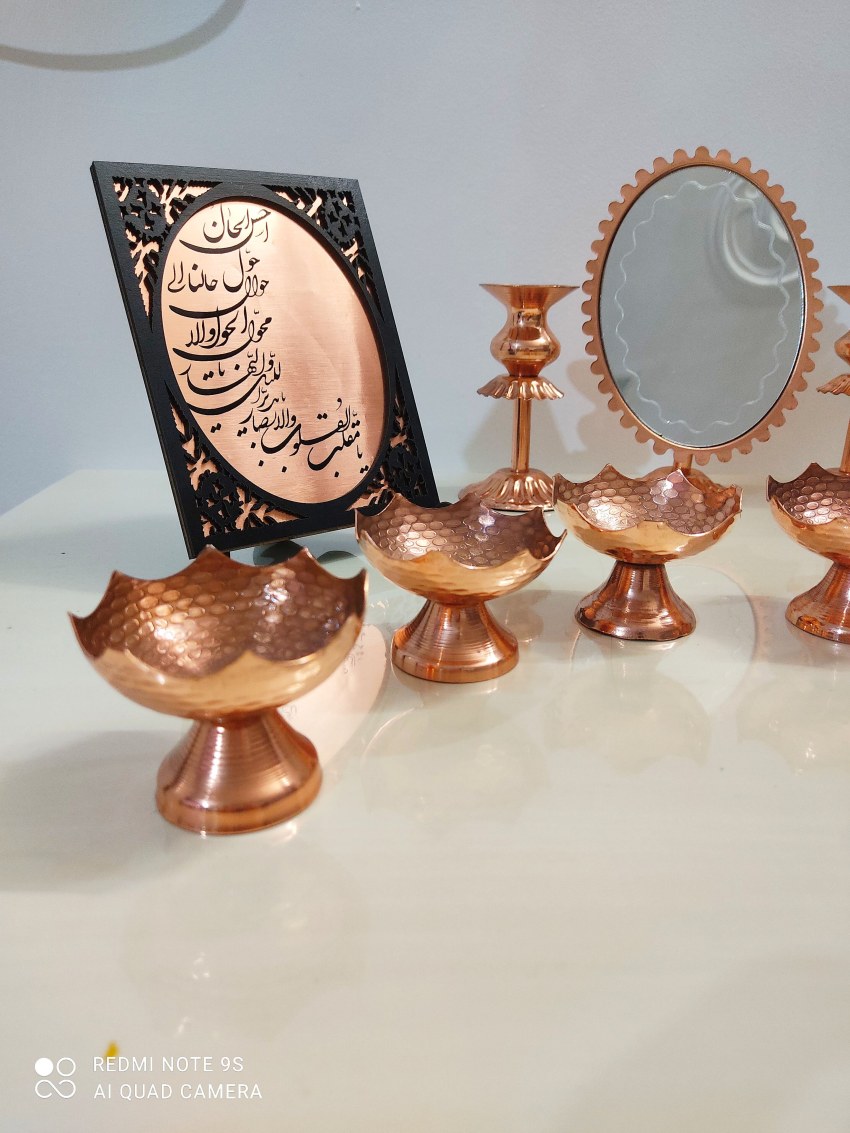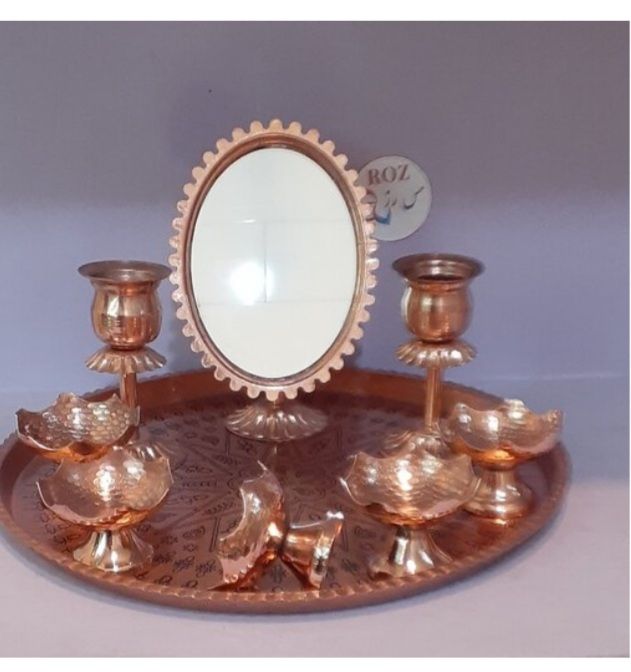 ائینه مسی با دو تا شعمدان مسی و یک عدد دعای تحویل سال و ۶ عدد هفت سین