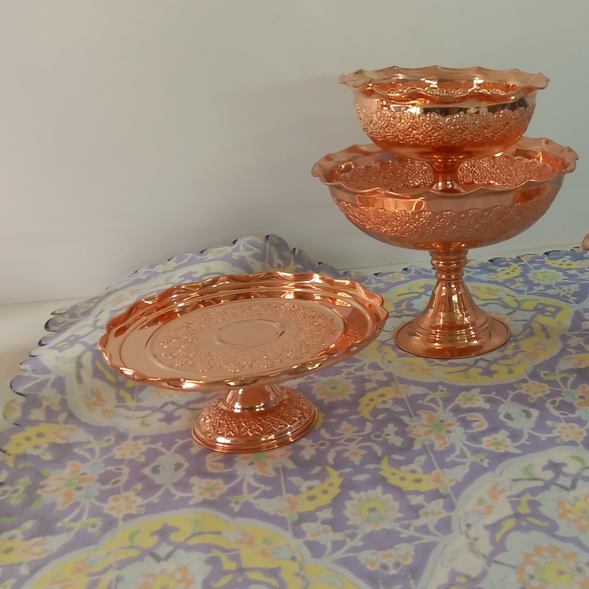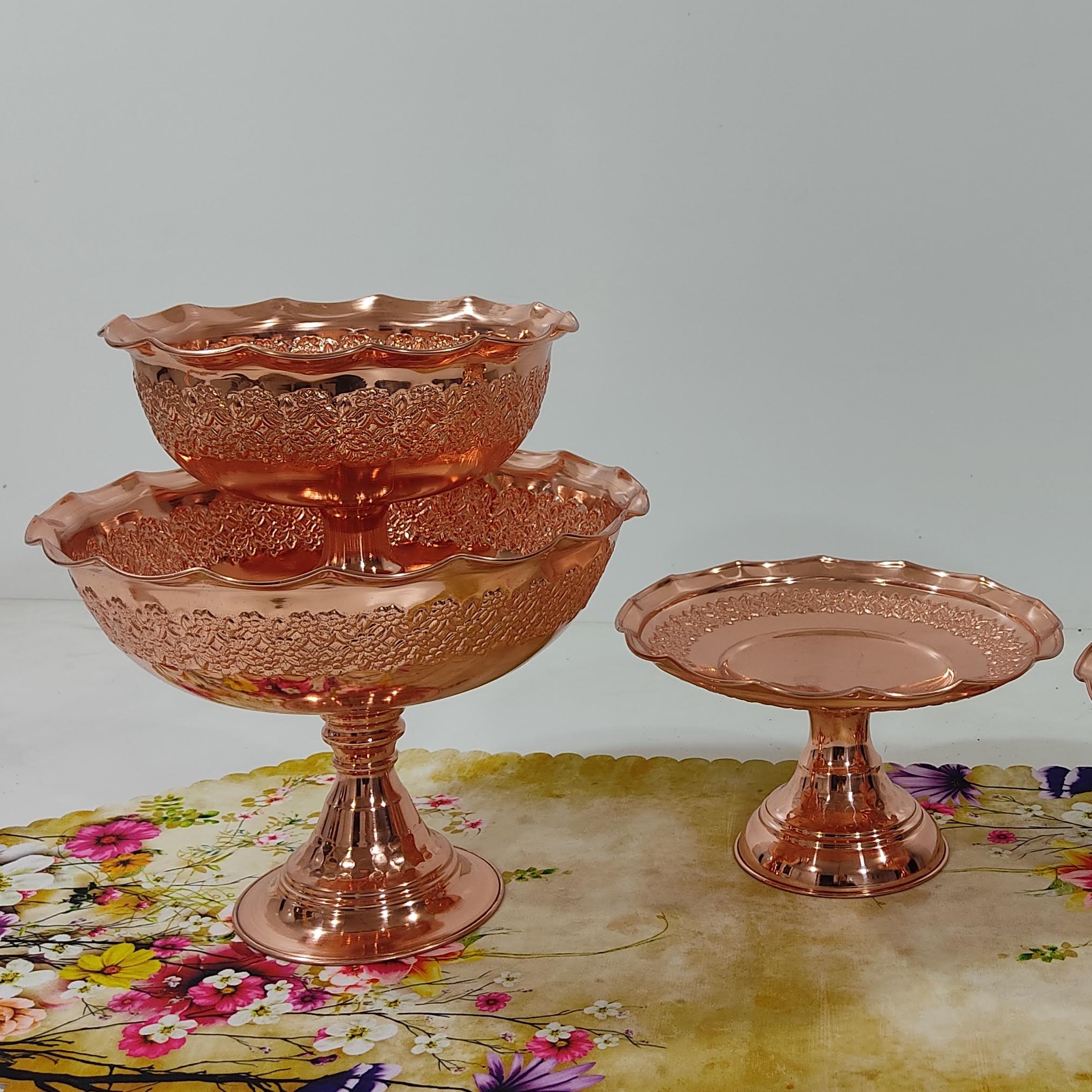 سرویس میوه خوری ،آجیل خوری و شیرینی خوری مسی روکش کروم خیلی زیبا محصول زنجان سرویس سه تیکه پذیرایی تمام مسی شامل اجیل خوری و شیرینی خوری و میوه خوری رز مس بسیار زیبا نانو رنگ ثابت بسیار براق ارسال رایگان