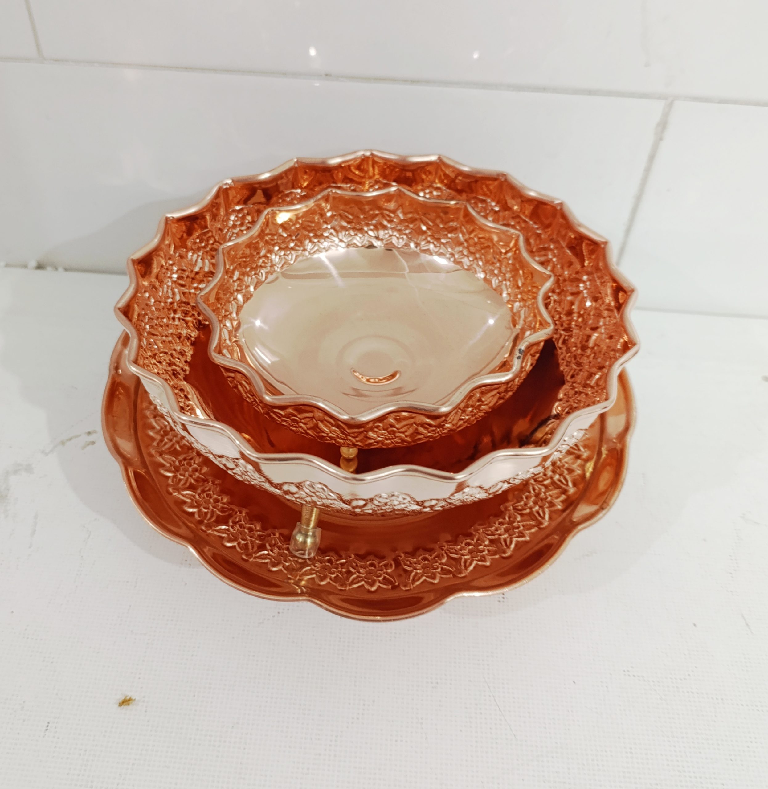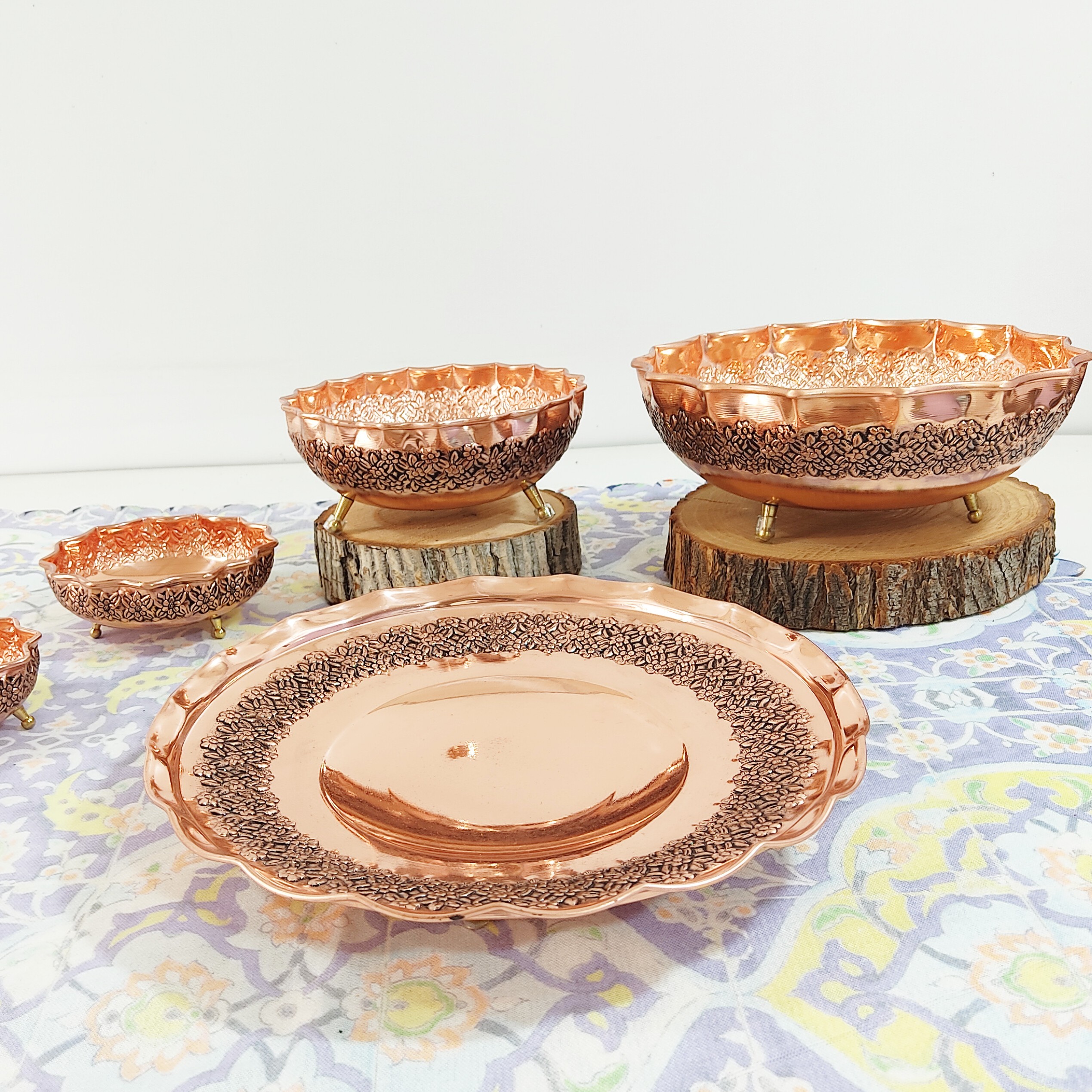 سرویس پذیرایی مسی 4 تیکه شامل میوهخوری مسی، شیرینی خوری مسی آجیلخوری مسی و شکلاتخوری مسی