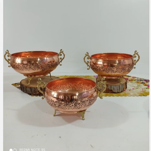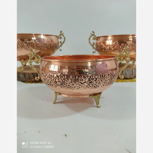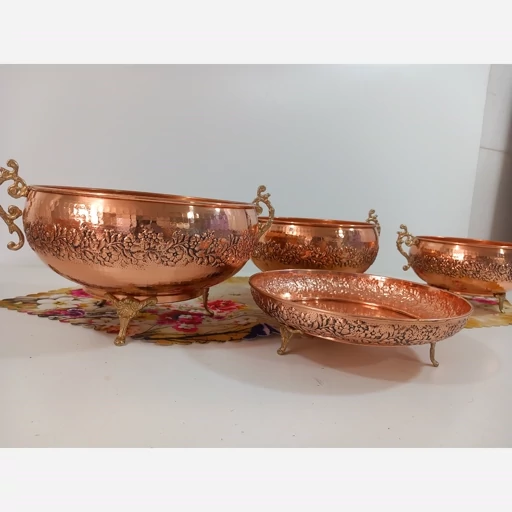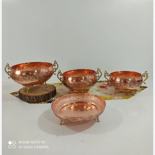 سرویس پذیرایی مسی چهار تیکه با پایه و دسته ی زیبا برنجی دست ساز زنجان گل کاری شده سیاه قلم تمام مسی با ورق بسیار ضخیم چکش کاری شده رنگ ثابت و نانو شده مدل کاسه ای خرید مستقیم از تولیدی مناسب میوه شکلات شیرینی آجیل اگه خاستید به صورت تکی هم میتونید تو گفتگو سفارش بدین خالص ترین ورق مسی قطر شکلات 17قطر اجیل 19قطر میوه و شیرینی 27 سانتیمتر