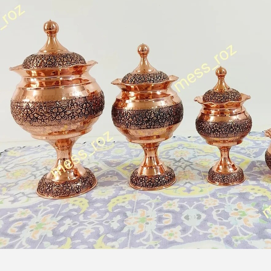 سرویس پذیرایی مسی سه تایی آجیل خوری .شکلات خوری و قندان مسی