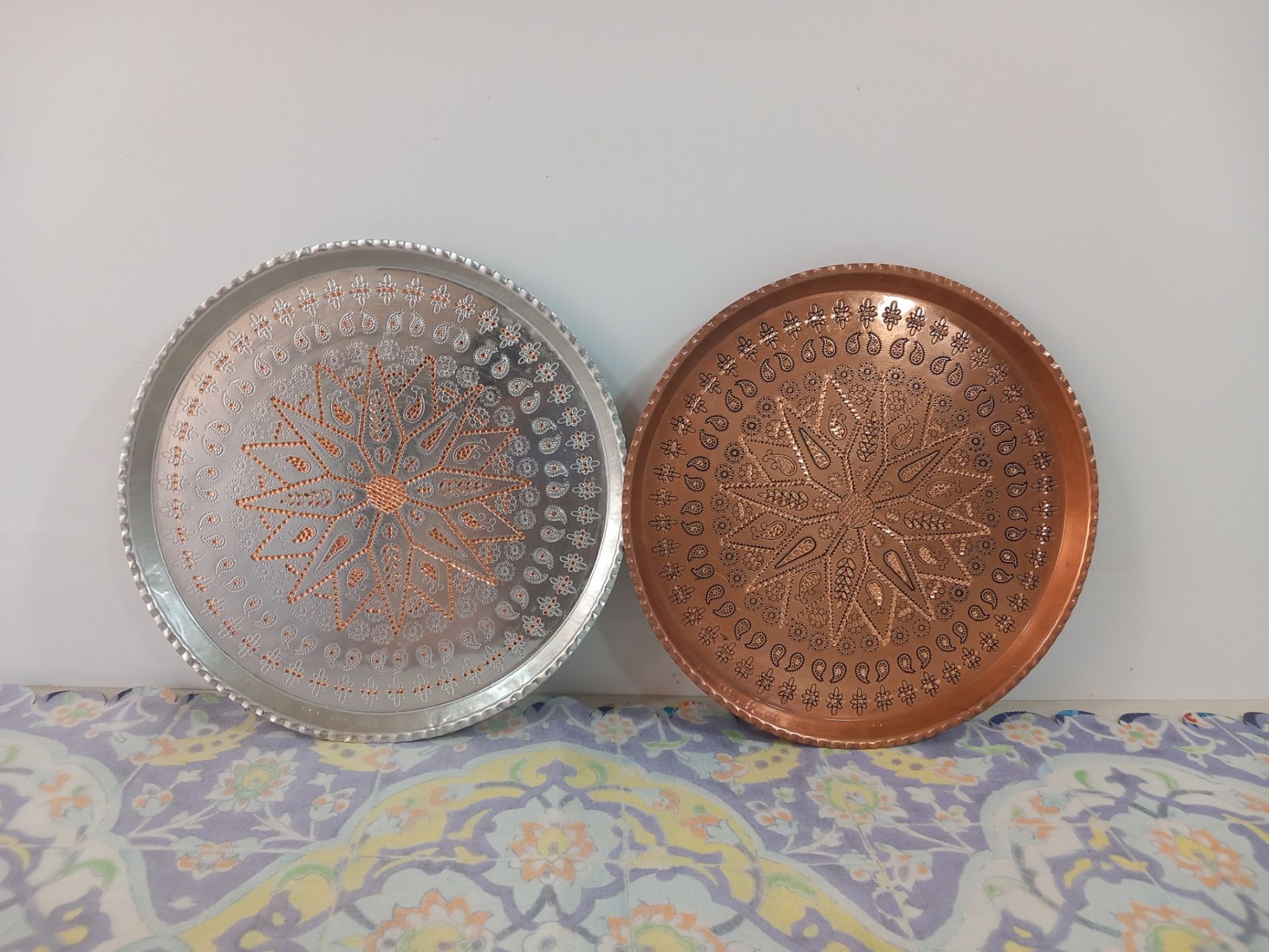 سینی مسی طرح ترمه تراش رنگ مسی با روکش نانو و روکش قلع هر دو به یک قیمت به انتخاب مشتری قطر 28 ضخیم شفاف ارسال رایگان طرح روی سینی طرمه سایز متوسط و خیلی کاربردی مناسب خانواده های 4 الی 6 نفره صنایع مس رز زنجان برترین در کیفیت