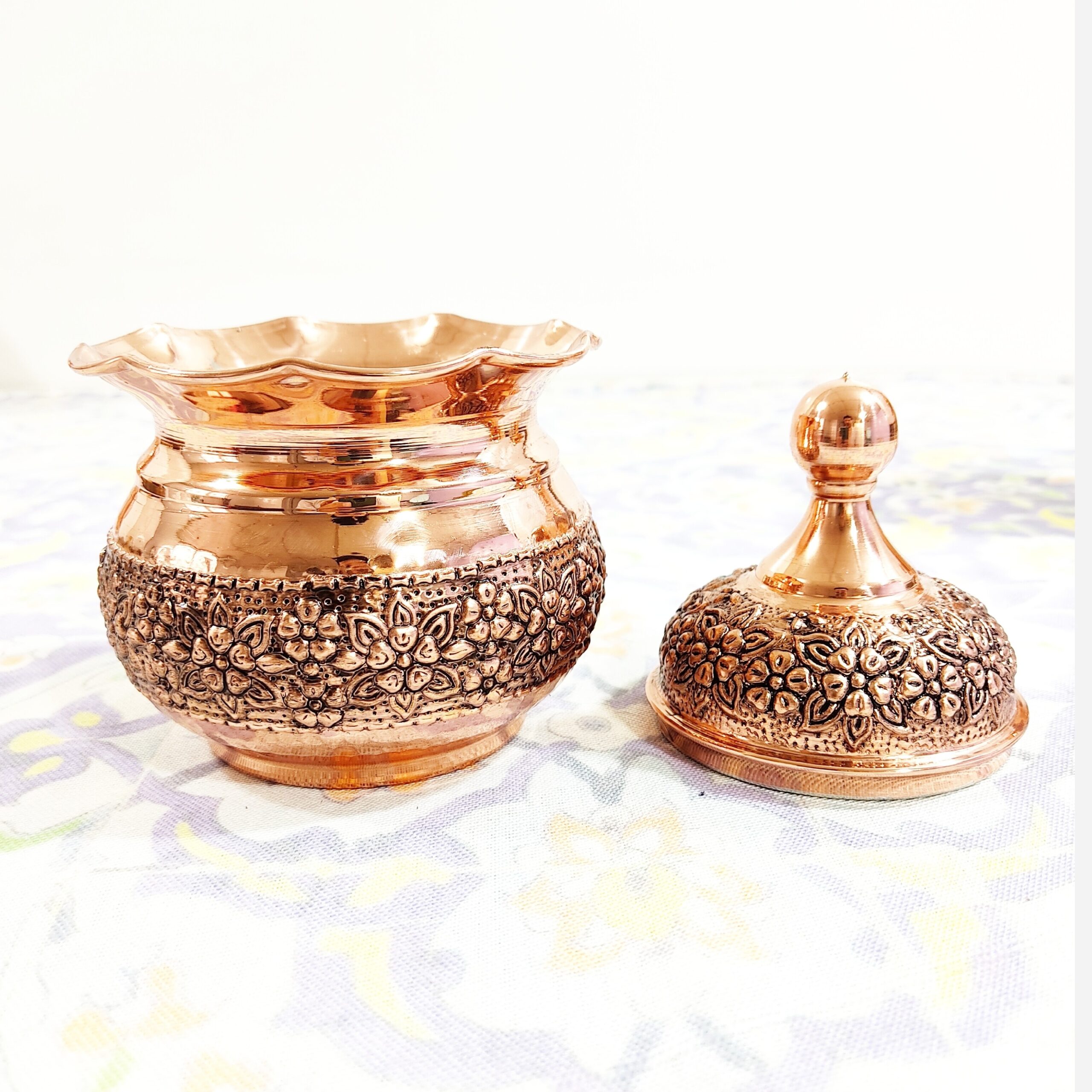 قندان مسی دست‌ساز با طرح گلبرگ قلم‌کاری شده، ترکیبی از زیبایی و کاربرد. ساخته شده از ورق مسی ضخیم، با پوشش قلع داخلی برای تضمین سلامت و ماندگاری بالا. رنگ ثابت آن، از تیرگی و تغییر رنگ جلوگیری می‌کند.
