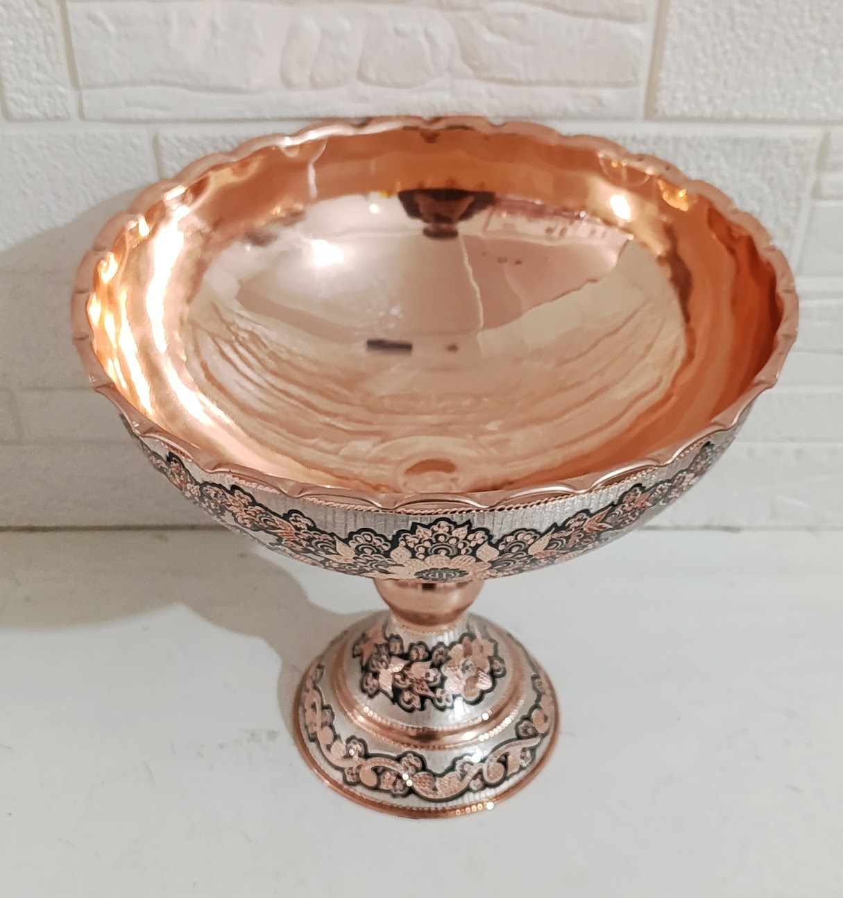 میوه خوری مسی روکش نقره کوب خیلی زیبا محصول زنجان ظروف پذیرایی مسی نقره کار هنرمندان زنجانی جنس جدید و جهانی شامل