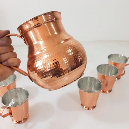 پارچ طرح ترک مسی با دسته برنجی چکش کاری شده و نانو شده رنگ ثابت همراه با 6 عدد لیوان تمام مسی مدل ترک با دسته برنجی زنجان