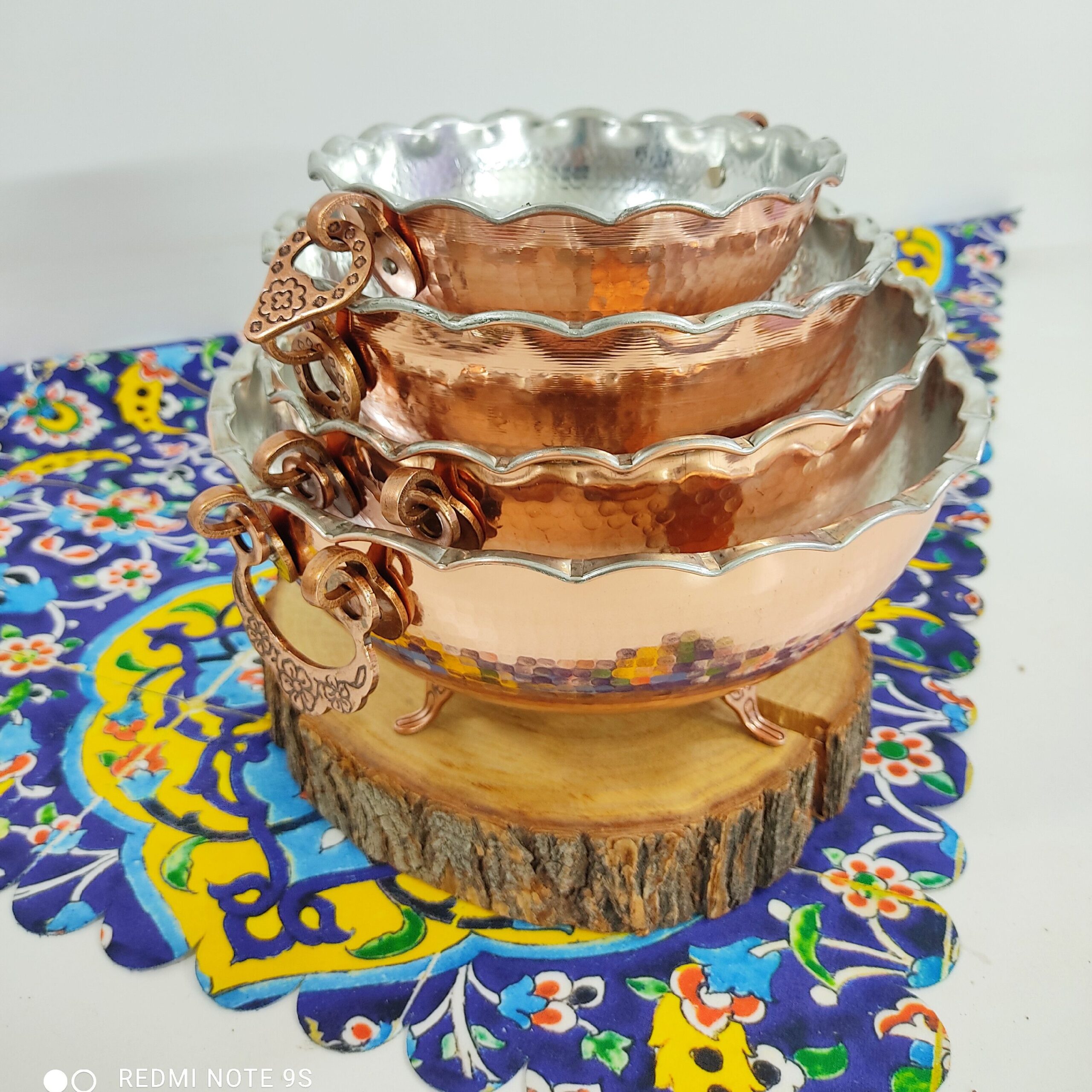 سینی مسی پایه دار در سه سایز داخل قلع پشت رنگ مسی پایه دار و گوشواره دار داخل طرح ترمه