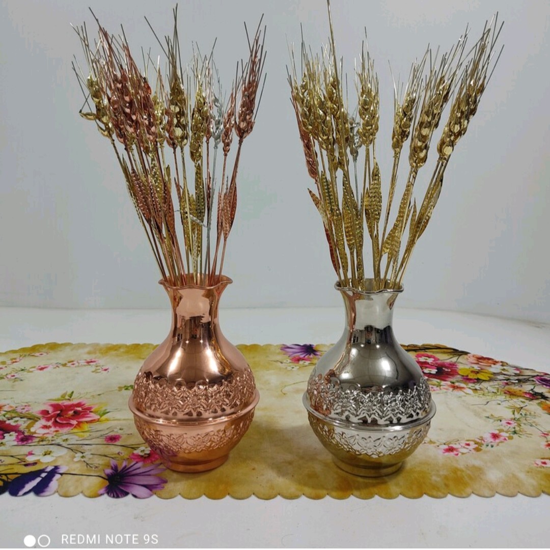 این گلدان بسیار زیبا رز مس مسی همراه ده تا شاخه گندمه چون تو این گلدون هر چی شاخه گندم زیاد تر باسه زیباتره انتخاب رنگ گندم ها با شماست ارسال رایگان رنگ ثابت نانو شده مناسب هدیه هفت سین ودکوری ارتفاع گلدان17 سانت