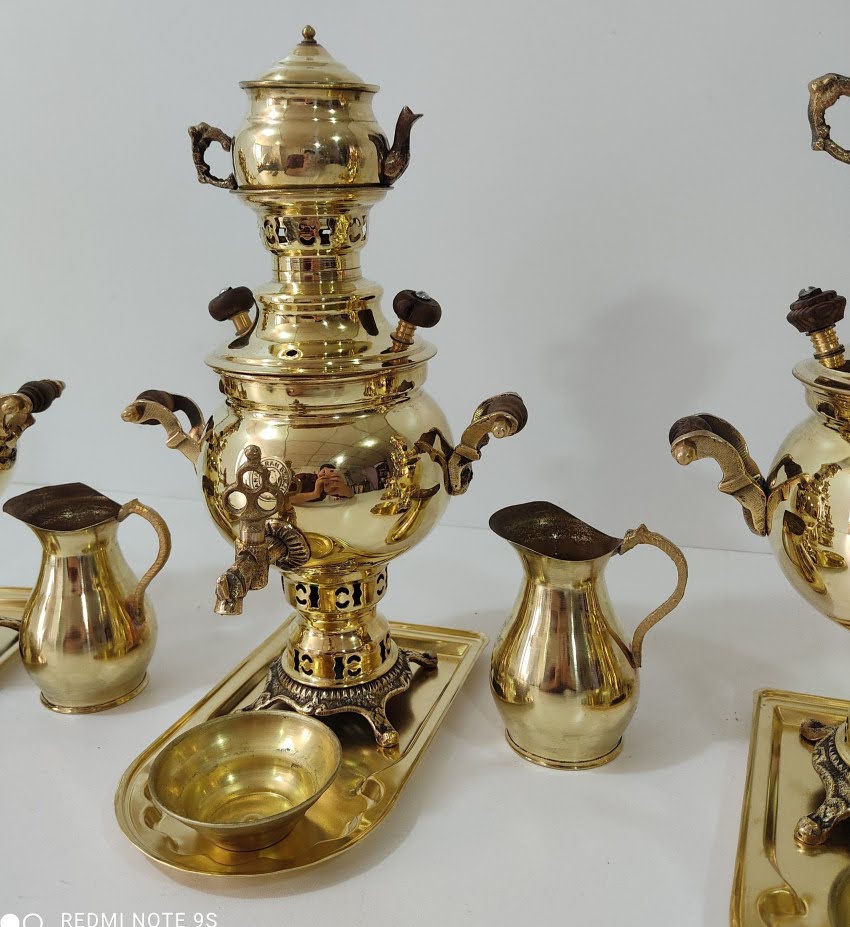سماور یک لیتری جنس برنج همراه سینی فوری پارچ و فندان